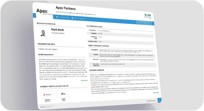 Apax Partners Apax Partners is a leading global private equity advisory firm. Founded: pre-1990 https://www.apax.com/ See More at NOAH Connect SPEAKER INFORMATION KEY CORPORATE FACTS Headquarters London, United Kingdom Mark Beith Employees 251-500 Managing Director Investment Buyout Stage Investment Style Active PRESENTATION TOPIC TARGET INVESTMENT CRITERIA Geographies Austria, Belgium, Switzerland, Czech Republic, Germany, Denmark, Estonia, Spain, Finland, France, United Kingdom, Fireside chat with Signavio Greece, Ireland, Italy, Lithuania, Latvia, Netherlands, Norway, Poland, Portugal, Sweden Verticals Revolutionary Consumer Products, Digital Health, Mobility & Travel of the Future, Edutech, Fintech & Insurtech, B2B SHORT BIOGRAPHY Software & Services, Industrial Digitisation Industries B2B, Business Insurance, Consumer Products, Digital Health, Digitalisation, EduTech, FinTech, Industrial, Mobility, Per- Mark Beith is Managing Director of Apax Digital and leads the team in Europe. He sonal Insurance, B2B Service Provider focuses on minority and buyout investments in high-growth software, internet and tech-enabled services businesses. He joined Apax in 2017 and has over 13 years of Transaction Growth Capital, Majority, Private Equity, Active Style Structures experience. He is based in London. Prior to joining Apax, Mark was at Silver Lake, where he executed the acquisition of several software businesses. He has also invest- ed in early stage technology businesses across Europe, Asia and Africa. Previously, BUSINESS OVERVIEW Mark was at Apollo Global Management, where he executed private equity and credit investments across a range of sectors, and before that he was a member of the Apax Partners is an independent global partnership focused solely on long-term investment in growth companies. Funds advised by Apax European and UK M&A teams at Morgan Stanley. Mark holds an M.A. in History from Partners typically invest in large companies with an enterprise value between €1bn and €5bn. The Funds invest in four sectors: Tech & Telco, the University of Cambridge. Services, Healthcare, and Consumer. READ MORE Releasing potential is at the heart of everything we do. Whether it’s identifying potential investments, growing our portfolio companies or realising their value at the right time, our strategy is geared to releasing potential. Throughout over 30 years since the raising of the first fund, the company has successfully invested across all investment stages, and through INTERNET PORTFOLIO HIGHTLIGHTS several complete economic cycles. The firm’s current success is rooted in a culture that has always been outward looking, pioneering and committed to growing businesses. The deep understanding of the four sectors in which it invests has been at the core of Apax Partners’ strategy, giving it early access to investment opportunities and an ability to quickly add value to portfolio companies. READ MORE Signavio Solita Germany Finland B2B Software & Servi… B2B Software & Servi… NOAH LONDON SPEAKER BOOK 88