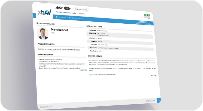 B2B + 4 Fintech & Insurtech xbAV We make pensions accessible for everybody Founded: 2007 https://www.xbav.de See More at NOAH Connect SPEAKER INFORMATION KEY CORPORATE FACTS Headquarters München, Germany Malte Dummel Other Offices Berlin, Germany CFO Saarbrücken, Germany Active Markets Germany Employees 101-250 Ownership Financial Investors PRESENTATION TOPIC Key Investors Armada Investment Group, Cinco Capital Buying and managing pension & life insurance made simple. Total Funding € 30m SHORT BIOGRAPHY BUSINESS OVERVIEW Malte has 10yrs+ of industry experience xbAV (‘xpension’) is one of the leading provider of pension & life insurance technology in Germany. Its software-as-a-service platform provides a He has been CFO at xbAV since 2017 shared service interface between insurers, insurance agents and customers to create new and manage existing pension & life insurance policies. Previously 8yrs at Goldman Sachs in pension advisory, corporate finance and tech- xbAV employs 100+ people in Munich (headquarters), Berlin and Saarbrücken. nology M&A BA and MA from University of Oxford with focus on finance and statistics More than 20 insurers, 9,000 insurance agents and 2,000 companies use xbAV’s services. Our platform has a c. 30% market share in Germany READ MORE already. xbAV closed its $24m Series B at NOAH Berlin 2018. READ MORE NOAH LONDON SPEAKER BOOK 84