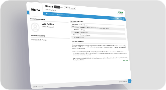 FinTech + 2 Fintech & Insurtech Klarna Simplifying Buying Founded: 2005 https://www.klarna.com See More at NOAH Connect SPEAKER INFORMATION KEY CORPORATE FACTS Headquarters Stockholm, Sweden Luke Griffiths Active Markets Austria, Belgium, Germany, United Kingdom, Netherlands, Norway, Sweden General Manager UK Employees 1,001-10,000 Ownership Financial Investors Key Investors Permira, VISA, Creandum PRESENTATION TOPIC Total Funding € 1,100m Fireside chat with Permira BUSINESS OVERVIEW Klarna was founded in 2005 in Stockholm, Sweden with the aim of making it easier for people to shop online. In the last 14 years, technology has evolved, excited, and transformed the world around us, yet our mission remains as relevant as ever – to make paying as simple, safe and above all, smoooth as possible. Klarna is now one of Europe’s largest banks and is providing payment solutions for 60 million consumers across 130,000 merchants in 14 countries. Klarna offers direct payments, pay after delivery options and installment plans in a smooth one-click purchase experience that lets consumers pay when and how they prefer to. When the company acquired SOFORT in 2014 the Klarna Group was formed. Klarna is backed by investors such as Sequoia Capital, Bestseller, Permira, Visa and Atomico. READ MORE NOAH LONDON SPEAKER BOOK 42