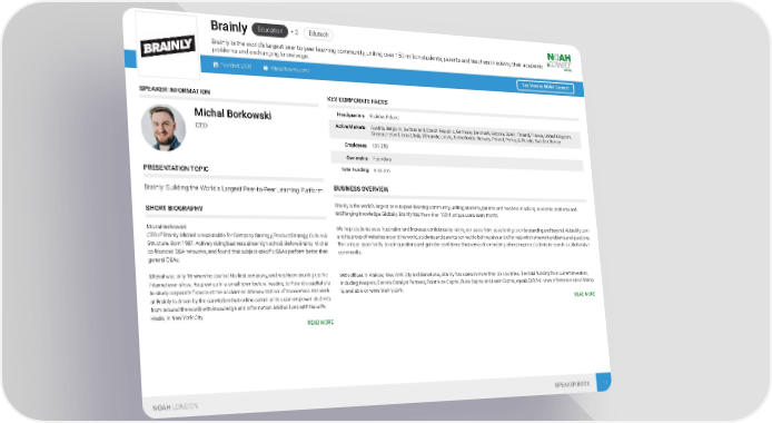 Education + 2 Edutech Brainly ainly is the world’s largest peer-to-peer learning community, uniting over 150 million students, parents and teachers in solving their academic Br problems and exchanging knowledge. Founded: 2009 https://brainly.com/ See More at NOAH Connect SPEAKER INFORMATION KEY CORPORATE FACTS Headquarters Kraków, Poland Michal Borkowski Active Markets Austria, Belgium, Switzerland, Czech Republic, Germany, Denmark, Estonia, Spain, Finland, France, United Kingdom, CEO Greece, Ireland, Israel, Italy, Lithuania, Latvia, Netherlands, Norway, Poland, Portugal, Russia, Sweden, Turkey Employees 101-250 Ownership Founders Total Funding € 62.4m PRESENTATION TOPIC BUSINESS OVERVIEW Brainly: Building the World's Largest Peer-to-Peer Learning Platform Brainly is the world’s largest peer-to-peer learning community, uniting students, parents and teachers in solving academic problems and SHORT BIOGRAPHY exchanging knowledge. Globally, Brainly has more than 150M unique users every month. Michał Borkowski We help students ease frustration and increase confidence by taking our users from questioning to understanding and beyond. At brainly.com CEO of Brainly. Michał is responsible for Company Strategy, Product Strategy, Culture & and its group of websites around the world, students and parents connect to both receive and offer help with homework problems and questions. Structure. Born 1987. Actively doing business since high school. Before Brainly, Michał The unique opportunity to ask questions and gain the confidence that comes from helping others inspires students to learn in a collaborative co-founded Q&A networks, and found that subject-specific Q&As perform better than community. general Q&As. Michał was only 16 when he started his first company, and he’s been shaking up the With offices in Krakow, New York City and Barcelona,, Brainly has users in more than 35 countries. The total funding from current investors, internet ever since. He grew up in a small town before heading to Poland’s capital city including Naspers, General Catalyst Partners, Point Nine Capital, Runa Capital and Learn Capital, equals $68.5M. More information about Brainly to study corporate finance at the acclaimed Warsaw School of Economics. His work is available on www.brainly.com. at Brainly is driven by the conviction that online communities can empower students READ MORE from around the world with knowledge and information. Michał lives with his wife, Kasia, in New York City. READ MORE NOAH LONDON SPEAKER BOOK 11