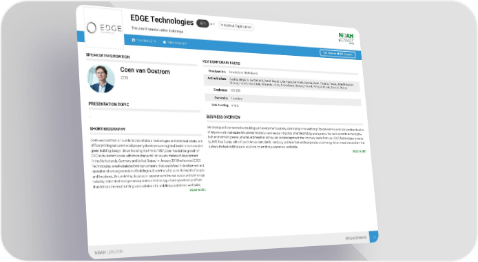B2B + 4 Industrial Digitisation EDGE Technologies The world needs better buildings Founded: 2018 http://edge.tech See More at NOAH Connect SPEAKER INFORMATION KEY CORPORATE FACTS Headquarters Amsterdam, Netherlands Coen van Oostrom Active Markets Austria, Belgium, Switzerland, Czech Republic, Germany, Denmark, Estonia, Spain, Finland, France, United Kingdom, CEO Greece, Ireland, Israel, Italy, Lithuania, Latvia, Netherlands, Norway, Poland, Portugal, Russia, Sweden, Turkey Employees 101-250 Ownership Founders Total Funding € N/A PRESENTATION TOPIC BUSINESS OVERVIEW . We develop and operate the best buildings and environments actively contributing to the wellbeing of people and the world. We combine decades SHORT BIOGRAPHY of experience in real estate with proven innovation and results in big data, smart technology and systems. Our team commits to making the built environment greener, smarter, and healthier with a user-centered approach that intuitively learns from use. EDGE Technologies is owned Coen van Oostrom is Founder & CEO of EDGE Technologies and OVG Real Estate, one by OVG Real Estate, with offices in Amsterdam, Berlin, Hamburg, and New York and incorporates a technology-driven operations platform that of Europe’s largest commercial property developers and a global leader in tech-enabled delivers the best buildings and solutions for ambitious customers, worldwide green building design. Since founding the firm in 1997, Coen has led the growth of READ MORE OVG to its current scope with more than a million square meters of development in the Netherlands, Germany and United States. In January 2018 he founded EDGE Technologies, a real estate technology company, that specialises in development and operation of a new generation of buildings with a primary focus on the health of people and the planet. By combining decades of experience in the real estate and technology industry, EDGE Technologies incorporates a technology driven operations platform that delivers the best buildings and solutions for ambitious customers worldwide. READ MORE NOAH LONDON SPEAKER BOOK 31