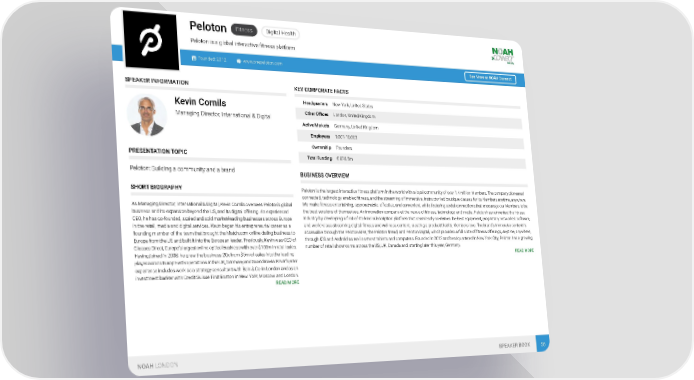 Fitness Digital Health Peloton on is a global interactive fitness platform Pelot Founded: 2012 www.onepeloton.com See More at NOAH Connect SPEAKER INFORMATION KEY CORPORATE FACTS Headquarters New York, United States Kevin Cornils Other Offices London, United Kingdom Managing Director, International & Digital Active Markets Germany, United Kingdom Employees 1,001-10,000 Ownership Founders PRESENTATION TOPIC Total Funding € 878.5m Peloton: Building a community and a brand BUSINESS OVERVIEW SHORT BIOGRAPHY Peloton is the largest interactive fitness platform in the world with a loyal community of over 1.4 million Members. The company pioneered connected, technology-enabled fitness, and the streaming of immersive, instructor-led boutique classes for its Members anytime, anywhere. We make fitness entertaining, approachable, effective, and convenient, while fostering social connections that encourage our Members to be As Managing Director, International & Digital, Kevin Cornils oversees Peloton’s global the best versions of themselves. An innovation company at the nexus of fitness, technology, and media, Peloton has reinvented the fitness business and its expansion beyond the US, and its digital offering. An experienced industry by developing a first-of-its-kind subscription platform that seamlessly combines the best equipment, proprietary networked software, CEO, he has co-founded, scaled and sold market-leading businesses across Europe and world-class streaming digital fitness and wellness content, creating a product that its Members love. The brand’s immersive content is in the retail, media and digital services. Kevin began his entrepreneurial career as a accessible through the Peloton Bike, the Peloton Tread, and Peloton Digital, which provides a full slate of fitness offerings, anytime, anywhere, founding member of the team that brought the Match.com online dating business to through iOS and Android as well as most tablets and computers. Founded in 2012 and headquartered in New York City, Peloton has a growing Europe from the US and built it into the European leader. Previously, Kevin was CEO of number of retail showrooms across the US, UK, Canada and, starting later this year, Germany. Glasses Direct, Europe's largest online optical business with over $100m in retail sales. READ MORE Having joined in 2008, he grew the business 20x from $5m of sales into the leading player across Europe with operations in the UK, Germany and Scandinavia. Kevin's prior experience includes work as a strategy consultant with Bain & Co. in London and as an investment banker with Credit Suisse First Boston in New York, Moscow and London. READ MORE NOAH LONDON SPEAKER BOOK 56