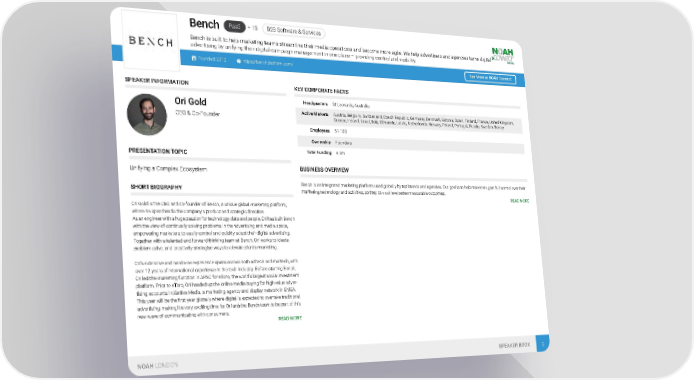 PaaS + 13 B2B Software & Services Bench eting teams streamline their media operations and become more agile. We help advertisers and agencies tame digital Bench is built to help mark advertising by unifying their digital campaign management in one place – providing control and visibility. Founded: 2012 https://benchplatform.com/ See More at NOAH Connect SPEAKER INFORMATION KEY CORPORATE FACTS Headquarters St Leonards, Australia Ori Gold Active Markets Austria, Belgium, Switzerland, Czech Republic, Germany, Denmark, Estonia, Spain, Finland, France, United Kingdom, CEO & Co-Founder Greece, Ireland, Israel, Italy, Lithuania, Latvia, Netherlands, Norway, Poland, Portugal, Russia, Sweden, Turkey Employees 51-100 Ownership Founders Total Funding € 0m PRESENTATION TOPIC BUSINESS OVERVIEW Unifying a Complex Ecosystem Bench is an integrated marketing platform used globally by top brands and agencies. Our goal is to help marketers gain full control over their SHORT BIOGRAPHY marketing technology and activities, so they can achieve better measurable outcomes. READ MORE Ori Gold is the CEO and co-founder of Bench, a unique global marketing platform, where he spearheads the company's product and strategic direction. As an engineer with a huge passion for technology, data and people, Ori has built Bench with the view of continually solving problems in the advertising and media space, empowering marketers to easily control and quickly adapt their digital advertising. Together with a talented and forward-thinking team at Bench, Ori works to ideate, problem solve, and creatively strategise ways to elevate client's marketing. Ori's extensive and hands-on experience spans across both ad tech and martech, with over 12 years of international experience in the tech industry. Before starting Bench, Ori led the marketing function in APAC for eToro, the world's largest social investment platform. Prior to eToro, Ori headed up the online media buying for high-value adver- tising accounts in Xertive Media, a marketing agency and display network in EMEA. This year will be the first year globally where digital is expected to overtake traditional advertising, making it a very exciting time for Ori and the Bench team to be part of this new wave of communicating with consumers. READ MORE NOAH LONDON SPEAKER BOOK 8