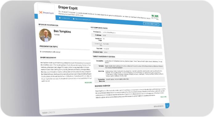 Draper Esprit ope to invent the future. Success depends on genuine collaboration, so when we meet teams that share our way of Our mission? Empower Eur thinking, we back them all the way Founded: 2006 http://www.draperesprit.com See More at NOAH Connect SPEAKER INFORMATION KEY CORPORATE FACTS Headquarters London, United Kingdom Ben Tompkins Employees 26-50 Partner Investment VC Stage Current Fund €m 1,000 Size PRESENTATION TOPIC Total AUM €m 2,000 Investment Style Active In conversation with Aircall TARGET INVESTMENT CRITERIA SHORT BIOGRAPHY Geographies Austria, Belgium, Switzerland, Germany, Denmark, Spain, Finland, France, United Kingdom, Ireland, Netherlands, Portugal, Sweden Ben has been working with technology entrepreneurs and their investors in Europe and the US all his career. Prior to joining Draper Esprit, Ben was Managing Partner at Eden Verticals Digital Health, Mobility & Travel of the Future, Edutech, Fintech & Insurtech, B2B Software & Services, Blockchain-Powered Ventures, a European early stage VC investor where he was responsible for invest- Businesses, Industrial Digitisation ments in Green Man Gaming, Borro, Huddle, Zemanta and Reevoo, amongst others. Industries Biotechnology, PaaS, Cryptocurrencies, SpaceTech, Engineering, Machine Learning, Deep Learning, Semiconductors, Ben was a tech investment banker at Broadview/Jefferies where he was co-head of B2B, B2C, Banking, Blockchain, Cloud, Cloud Services, Consumer Electronics, Cyber Security, Data, Digital Health, the Global Software, Services & Media practice and advised on deals including Blizzard E-Commerce, EduTech, Enterprise Hardware, FinTech, Hardware, Healthcare / Pharma, InsurTech, PropTech, Software, Studios/World of Warcraft, Iris Software (LSE), KLoot, Promethean, ICV and uDate. At Venture Capital, Wellness, Mobility, SaaS Draper Esprit, Ben oversees the investment team and sits on the board of both Aircall Transaction Growth Capital, Venture Capital, Active Style and Finalcad. Structures READ MORE BUSINESS OVERVIEW Draper Esprit is one of the most active venture capital firms in Europe, helping to build and invest in disruptive, high growth technology companies. We believe the best entrepreneurs in Europe are capable of building the global businesses of the future. We fuel their growth with long- term capital, access to international networks and decades of experience building businesses. We are the European arm of the Draper Venture Network, a global venture capital alliance, giving our portfolio access to a global footprint of corporates and investors. READ MORE NOAH LONDON SPEAKER BOOK 90