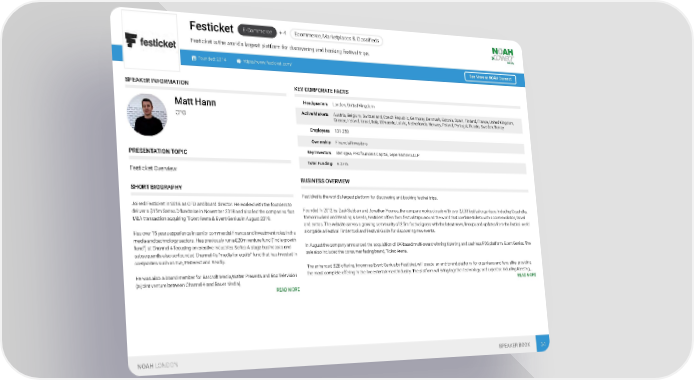 ce, Marketplaces & Classifieds E-Commerce + 4 Ecommer Festicket Festicket is the world's largest platform for discovering and booking festival trips. Founded: 2014 https://www.festicket.com/ See More at NOAH Connect SPEAKER INFORMATION KEY CORPORATE FACTS Headquarters London, United Kingdom Matt Hann Active Markets Austria, Belgium, Switzerland, Czech Republic, Germany, Denmark, Estonia, Spain, Finland, France, United Kingdom, CFO Greece, Ireland, Israel, Italy, Lithuania, Latvia, Netherlands, Norway, Poland, Portugal, Russia, Sweden, Turkey Employees 101-250 Ownership Financial Investors Key Investors Beringea, PROfounders Capital, Lepe Partners LLP PRESENTATION TOPIC Total Funding € 27m Festicket Overview BUSINESS OVERVIEW SHORT BIOGRAPHY Festicket is the world's largest platform for discovering and booking festival trips. Joined Festicket in 2018 as CFO and board director. He worked with the founders to Founded in 2012 by Zack Sabban and Jonathan Younes, the company works closely with over 2,000 festival organisers including Coachella, deliver a $15m Series D fundraise in November 2018 and also led the companies first Tomorrowland and Reading & Leeds, Festicket offers fans festival trips around the world that combine tickets with accommodation, travel M&A transaction acquiring Ticket Arena & Event Genius in August 2019. and extras. The website serves a growing community of 2.5m festival goers with the latest news, lineups and updates from the festival world alongside a Festival Finder tool and Festival Guide for discovering new events. Has over 15 years experience in senior commercial finance and investment roles In the media and technology sectors. Has previously run a £20m venture fund ("indie growth In August the company announced the acquisition of UK-based multi-award winning ticketing and cashless POS platform, Event Genius. The fund") at Channel 4 focusing on creative industries Series A stage businesses and sale also included the consumer facing brand, Ticket Arena. subsequently also co-founded Channel 4's "media for equity" fund that has invested in companies such as Eve, Pinterest and Readly. The enhanced B2B offering, known as Event Genius by Festicket, will create an end-to-end platform for organisers and fans alike, providing the most complete offering in the live entertainment industry. The platform will bring together technology and expertise including ticketing,… He was also a board member for Barcroft Media,Walter Presents and Box Television READ MORE (a joint venture between Channel 4 and Bauer Media). READ MORE NOAH LONDON SPEAKER BOOK 34