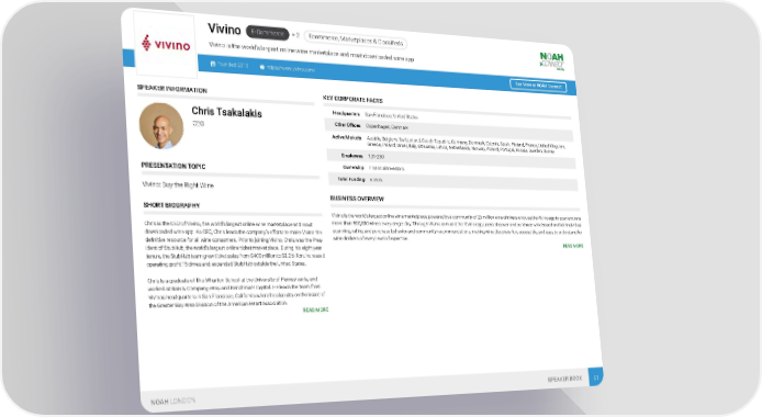ce, Marketplaces & Classifieds E-Commerce + 2 Ecommer Vivino Vivino is the world's largest online wine marketplace and most downloaded wine app Founded: 2010 https://www.vivino.com/ See More at NOAH Connect SPEAKER INFORMATION KEY CORPORATE FACTS Headquarters San Francisco, United States Chris Tsakalakis Other Offices Copenhagen, Denmark CEO Active Markets Austria, Belgium, Switzerland, Czech Republic, Germany, Denmark, Estonia, Spain, Finland, France, United Kingdom, Greece, Ireland, Israel, Italy, Lithuania, Latvia, Netherlands, Norway, Poland, Portugal, Russia, Sweden, Turkey Employees 101-250 Ownership Financial Investors PRESENTATION TOPIC Total Funding € 59m Vivino: Buy the Right Wine BUSINESS OVERVIEW SHORT BIOGRAPHY Vivino is the world's largest online wine marketplace, powered by a community of 26 million wine drinkers who use the Vivino app to scan and rate more than 500,000 wines every single day. Through Vivino.com and the Vivino app, users discover and purchase wine based on their individual Chris is the CEO of Vivino, the world's largest online wine marketplace and most scanning, rating and purchase behavior and community recommendations, making wine discovery fun, accessible, and easy to understand for downloaded wine app. As CEO, Chris leads the company’s efforts to make Vivino the wine drinkers of every level of expertise. definitive resource for all wine consumers. Prior to joining Vivino, Chris was the Pres- READ MORE ident of StubHub, the world's largest online ticket marketplace. During his eight-year tenure, the StubHub team grew ticket sales from $400 million to $3.2 billion, increased operating profit 15 times and expanded StubHub outside the United States. Chris is a graduate of The Wharton School at the University of Pennsylvania, and worked at Bain & Company, eBay and Benchmark Capital. He leads the team from Vivino’s headquarters in San Francisco, California where he also sits on the board of the Greater Bay Area Division of the American Heart Association. READ MORE NOAH LONDON SPEAKER BOOK 81