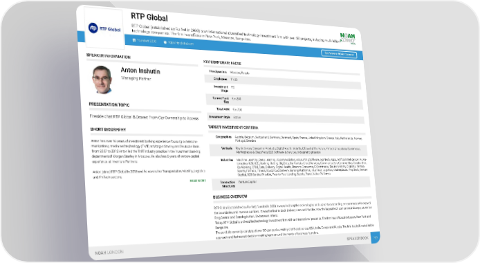 RTP Global RTP Global (established as Ru-Net in 2000) is an international diversified technology investment firm with over 50 projects, including multi-billion technology companies. The firm has offices in New York, Moscow, Bangalore. Founded: 2000 http://rtp-global.com See More at NOAH Connect SPEAKER INFORMATION KEY CORPORATE FACTS Headquarters Moscow, Russia Anton Inshutin Employees 11-25 Managing Partner Investment VC Stage Current Fund €m 200 Size PRESENTATION TOPIC Total AUM €m 750 Investment Style Active Fireside chat RTP Global & Drover: From Car Ownership to Access TARGET INVESTMENT CRITERIA SHORT BIOGRAPHY Geographies Austria, Belgium, Switzerland, Germany, Denmark, Spain, France, United Kingdom, Greece, Italy, Netherlands, Norway, Portugal, Sweden Anton has over 16 years of investment banking experience focusing on telecom- munications, media and technology (TMT) at Morgan Stanley and Deutsche Bank. Verticals Revolutionary Consumer Products, Digital Health, Mobility & Travel of the Future, Fintech & Insurtech, Ecommerce, From 2007 to 2012 Anton led the TMT industry practice in the investment banking Marketplaces & Classifieds, B2B Software & Services, Industrial Digitisation department of Morgan Stanley in Moscow. He also has 6 years of venture capital Industries Machine Learning, Deep Learning, Accommodation, Accounting Software, AgriTech, Apps, Artificial Intelligence / AI, Au- experience at Inventure Partners. tomotive, B2B, B2C, Banking, Betting, Big Data, Car Rentals, Cloud Services, Communication, Communities, Construction, Co-Working, CRM, Data, Delivery, Digital Health, Direct-to-Consumer, E-Commerce, Electro-Mobility, E-Sports, Fantasy Anton joined RTP Global in 2018 and he covers the Transportation/Mobility, Logistics Sports, FinTech, Fitness, Food, Food Delivery, Gaming Platforms, InsurTech, Logistics, Marketplaces, PropTech, Venture Capital, B2B Service Provider, Peer-to-Peer Lending, Sports, Travel, Video Platforms and FinTech sectors. READ MORE Transaction Venture Capital Structures BUSINESS OVERVIEW RTP Global (established as Ru-Net) founded in 2000, invests in disruptive technologies and supports outstanding entrepreneurs who expand the boundaries and improve our lives. It was the first to back Delivery Hero and Yandex, now the largest tech companies in Europe, as well as Ring Central and Datadog in the USA between others. Today, RTP Global is a diversified technology investment firm with an international presence. The firm has offices in Moscow, New York and Bangalore. The portfolio currently consists of over 50 companies, mainly distributed across USA, India, Europe and Russia. The firm has built out a flexible approach and fast-paced decision-making team around the needs of business founders. RTP Global invests mainly in the consumer internet space and software companies. The main focus areas are AI, FoodTech, HealthTech, NOAH LONDON SPEAKER BOOK 100 MediaTech (including Sport), Mobility, PropTech, FinTech, IoT and B2B Saas. Stage-wise RTP Global looks at a late seed, Series A and B. READ MORE