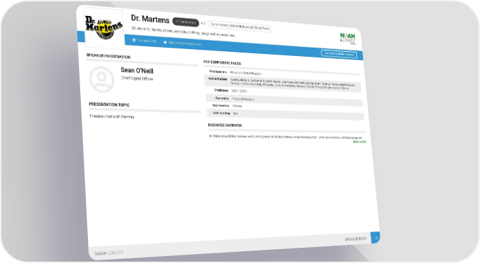 ce, Marketplaces & Classifieds E-Commerce + 2 Ecommer Dr. Martens US store for boots, shoes, sandals, clothing, bags and accessories. Founded: 1995 http://www.drmartens.com See More at NOAH Connect SPEAKER INFORMATION KEY CORPORATE FACTS Headquarters Wollaston, United Kingdom Sean O’Neill Active Markets Austria, Belgium, Switzerland, Czech Republic, Germany, Denmark, Estonia, Spain, Finland, France, United Kingdom, Chief Digital Officer Greece, Ireland, Israel, Italy, Lithuania, Latvia, Netherlands, Norway, Poland, Portugal, Russia, Sweden, Turkey Employees 1,001-10,000 Ownership Financial Investors Key Investors Permira PRESENTATION TOPIC Total Funding N/A Fireside chat with Permira BUSINESS OVERVIEW Dr. Martens is a British footwear and clothing brand, which also makes a range of accessories – shoe care products, clothing, luggage, etc. READ MORE NOAH LONDON SPEAKER BOOK 30