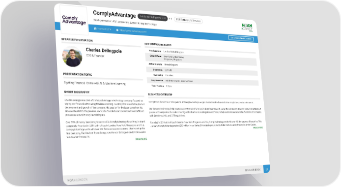Artificial Intelligence / AI + 4 B2B Software & Services ComplyAdvantage Next-generation AML screening & monitoring technology. Founded: 2014 https://complyadvantage.com/ See More at NOAH Connect SPEAKER INFORMATION KEY CORPORATE FACTS Headquarters London, United Kingdom Charles Delingpole Other Offices New York, United States CEO & Founder Singapore, Singapore Active Markets United Kingdom Employees 251-500 Ownership Founders PRESENTATION TOPIC Key Investors Balderton Capital, Index Ventures Fighting Financial Crime with AI & Machine Learning Total Funding € 35m SHORT BIOGRAPHY BUSINESS OVERVIEW Charles Delingpole is CEO of ComplyAdvantage, a technology company focused on Compliance doesn’t have to be painful. At ComplyAdvantage we give businesses the financial crime insight they need to take control. wiping out financial crime using Machine Learning. As CEO, Charles leads the product development and growth of the company. His passion for the issue came from his Our data and technology help you to uncover the risk of who you’re doing business with, using the world’s only dynamic global risk database of time as the MLRO of a previous startup he founded when he realized how inefficient people and companies. Our suite of configurable cloud services integrates seamlessly to help automate and reduce the frustration of complying processes around money laundering are. with Sanctions, AML and CFT regulations. Over 99% of money laundering is successful, ComplyAdvantage is working to stop it Founded in 2014 with offices in London, New York, Singapore, and Cluj, ComplyAdvantage work with over 450 firms across 45 countries. This completely. Founded in 2014 with offices in London, New York, Singapore, and Cluj, January, ComplyAdvantage raised $30 million in our Series B fundraising round led by Index Ventures and joined by Balderton Capital. ComplyAdvantage work with over 350 firms across 45 countries. Charles set up his READ MORE first company, The Student Room Group, now the world’s largest student discussion forum when he was 16. READ MORE NOAH LONDON SPEAKER BOOK 21