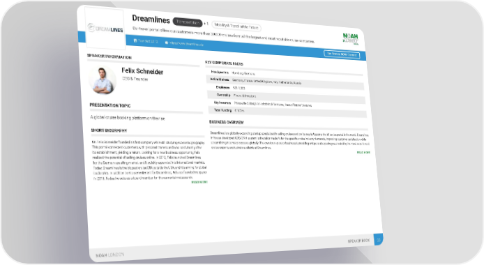 ransportation + 1 Mobility & Travel of the Future T Dreamlines Our travel portal offers our customers more than 30.000 cruises from all the largest and most reputable cruise companies. Founded: 2012 https://www.dreamlines.de See More at NOAH Connect SPEAKER INFORMATION KEY CORPORATE FACTS Headquarters Hamburg, Germany Felix Schneider Active Markets Germany, France, United Kingdom, Italy, Netherlands, Russia CEO & Founder Employees 501-1,000 Ownership Financial Investors Key Investors Princeville Global, HV Holtzbrinck Ventures, Hasso Plattner Ventures PRESENTATION TOPIC Total Funding € 107m A global cruise booking platform on the rise BUSINESS OVERVIEW SHORT BIOGRAPHY Dreamlines is a globally expanding startup specialized in selling cruises and on its way to become the #1 cruise portal in the world. Dreamlines in-house developed GDS/CRM system is the tailor-made fit for the specific cruise industry demands, improving customer satisfaction while streamlining internal processes globally. The own tour operator business is providing unique cruise packages, created by the most experienced Mr. Felix Schneider founded his first company while still studying economic geography. cruise experts, exclusively available at Dreamlines. This portal connected customers with personal trainers and was sold shortly after READ MORE its establishment, yielding a return. Looking for a new business opportunity, Felix realized the potential of selling cruises online. In 2012, Felix launched Dreamlines for the German-speaking market, and it quickly expanded into international markets. Today, Dreamlines is the biggest cruise OTA outside the USA, and it is aiming for global leadership. In addition to his commitment for Dreamlines, Felix co-founded Happycar in 2013. Today, he acts as a board member for the car rental metasearch. READ MORE NOAH LONDON SPEAKER BOOK 28