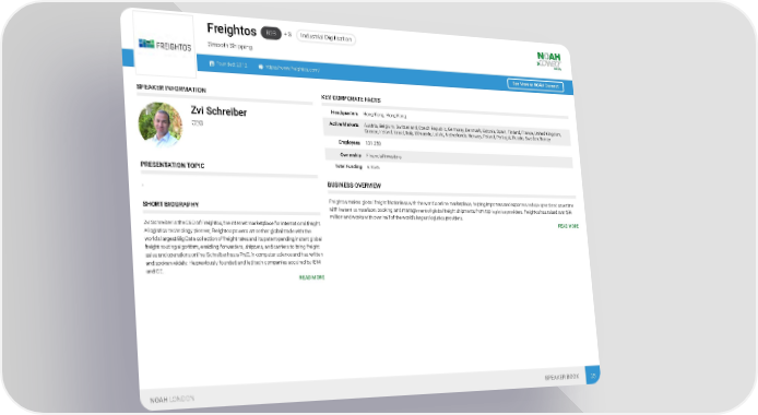 B2B + 3 Industrial Digitisation Freightos Smooth Shipping Founded: 2012 https://www.freightos.com/ See More at NOAH Connect SPEAKER INFORMATION KEY CORPORATE FACTS Headquarters Hong Kong, Hong Kong Zvi Schreiber Active Markets Austria, Belgium, Switzerland, Czech Republic, Germany, Denmark, Estonia, Spain, Finland, France, United Kingdom, CEO Greece, Ireland, Israel, Italy, Lithuania, Latvia, Netherlands, Norway, Poland, Portugal, Russia, Sweden, Turkey Employees 101-250 Ownership Financial Investors Total Funding € 95m PRESENTATION TOPIC BUSINESS OVERVIEW . Freightos makes global freight frictionless with the world’s online marketplace, helping importers and exporters reduce spend and save time SHORT BIOGRAPHY with instant comparison, booking, and management of global freight shipments from top logistics providers. Freightos has raised over $94 million and works with over half of the world's largest logistics providers. Zvi Schreiber is the CEO of Freightos, the internet marketplace for international freight. READ MORE A logistics technology pioneer, Freightos powers smoother global trade with the world's largest Big Data collection of freight rates and its patent-pending instant global freight routing algorithm, enabling forwarders, shippers, and carriers to bring freight sales and operations online. Schreiber has a Ph.D. in computer science and has written and spoken widely. He previously founded and led tech companies acquired by IBM and GE. READ MORE NOAH LONDON SPEAKER BOOK 35