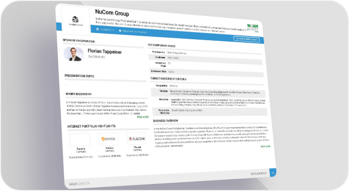 NuCom Group oSiebenSat.1 bundles its commerce business. Its investment portfolio consists of companies that are market leaders in In the NuCom Group Pr their segments. NuCom Group intends to become the leading European growth platform in the consumer internet sector. Founded: 2018 https://www.nucom.group/ See More at NOAH Connect SPEAKER INFORMATION KEY CORPORATE FACTS Headquarters Unterföhring, Germany Florian Tappeiner Employees 1,001-10,000 Co-CEO & MD Investment VC Stage Investment Style Active PRESENTATION TOPIC TARGET INVESTMENT CRITERIA Geographies Germany . Verticals Revolutionary Consumer Products, Cognitive Computing, Digital Health, Mobility & Travel of the Future, Fintech & Insurtech, Ecommerce, Marketplaces & Classifieds, Industrial Digitisation SHORT BIOGRAPHY Industries Aggregation, B2C, Banking, Consumer Products, Customer Experience / VoC, Customer Service Platform, Dating, Digital Health, Digital Services, Direct-to-Consumer, E-Commerce Infrastructure, E-Commerce Platform, Furniture, Marketplaces, Dr. Florian Tappeiner is Co-CEO of NCG - NuCom Group SE and Managing Director Serious Dating, Tourism, Toys, Travel, Vacation Rentals, Website Conversion / Personalization of NCG Commerce GmbH. Florian Tappeiner has been at ProSiebenSat.1 since 2015 and has led the Group's M&A Department as Executive Vice President M&A. Before Transaction Growth Capital, Majority, Active Style Structures ProSiebenSat.1, Florian was Director of the Private Equity firm H.I.G. Capital. READ MORE BUSINESS OVERVIEW INTERNET PORTFOLIO HIGHTLIGHTS In the NuCom Group ProSiebenSat.1 bundles its commerce business. The NuCom Group's investment portfolio consists of companies and brands that are market leaders in their respective segments. These include Amorelie, Aroundhome, billiger-mietwagen.de, Flaconi, the Jochen Schweizer mydays Group, moebel.de, the Parship Group with Parship, ElitePartner and eharmony as well as Stylight, Verivox and WindStar Medical. In 2018, NuCom generated revenues of 831 million euros. In 2019, the company is aiming for sales of 1 billion euros. Combining organic growth of its investments and further strategic acquisitions, NuCom Group intends to become the leading European growth platform in the consumer Internet sector. Parship Verivox Flaconi Germany Germany Germany READ MORE Revolutionary Consum… Ecommerce, Marketpla… Ecommerce, Marketpla… NOAH LONDON SPEAKER BOOK 98