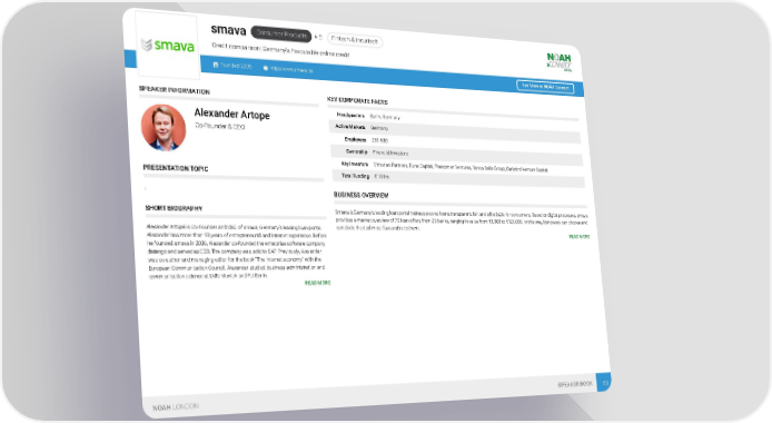 Consumer Products + 2 Fintech & Insurtech smava Credit comparison: Germany's Favourable online credit Founded: 2005 http://www.smava.de See More at NOAH Connect SPEAKER INFORMATION KEY CORPORATE FACTS Headquarters Berlin, Germany Alexander Artope Active Markets Germany Co-Founder & CEO Employees 251-500 Ownership Financial Investors Key Investors Vitruvian Partners, Runa Capital, Phenomen Ventures, Banca Sella Group, Earlybird Venture Capital PRESENTATION TOPIC Total Funding € 119m . BUSINESS OVERVIEW SHORT BIOGRAPHY Smava is Germany’s leading loan portal makes personal loans transparent, fair, and affordable for consumers. Based on digital processes, smava provides a market overview of 70 loan offers from 25 banks, ranging in value from €1,000 to €120,000. In this way, borrowers can choose and conclude the deal most favourable to them. Alexander Artopé is Co-Founder and CEO of smava, Germany’s leading loan portal. READ MORE Alexander has more than 18 years of entrepreneurial and Internet experience. Before he founded smava in 2006, Alexander co-founded the enterprise software company datango and served as CEO. The company was sold to SAP. Previously, Alexander was co-author and managing editor for the book “The internet economy” with the European Communication Council. Alexander studied business administration and communication science at LMU Munich and FU Berlin. READ MORE NOAH LONDON SPEAKER BOOK 68