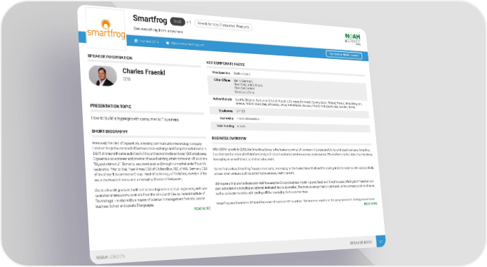 oducts SaaS + 1 Revolutionary Consumer Pr Smartfrog See everything from anywhere. Founded: 2014 http://www.smartfrog.com See More at NOAH Connect SPEAKER INFORMATION KEY CORPORATE FACTS Headquarters Dublin, Ireland Charles Fraenkl Other Offices Berlin, Germany CEO New York, United States Baar, Switzerland Shenzhen, China Active Markets Austria, Belgium, Switzerland, Czech Republic, Germany, Denmark, Estonia, Spain, Finland, France, United Kingdom, Greece, Ireland, Israel, Italy, Lithuania, Latvia, Netherlands, Norway, Poland, Portugal, Russia, Sweden, Turkey PRESENTATION TOPIC Employees 51-100 Ownership Financial Investors How to build a hypergrowth consumer IoT business Total Funding € 55m SHORT BIOGRAPHY BUSINESS OVERVIEW Previously the CEO of Gigaset AG, a leading communication technology company listed on the prime standard of German stock-exchange and Europe's market leader in With 500%+ growth in 2018, the Smartfrog Group is the fastest-growing IoT company in Europe and US. As a full-stack company, Smartfrog DECT phones with sales activities in 70 countries worldwide and over 1200 employees. has developed a universal IoT platform designed to build dedicated solutions across product areas. The platform enables data-driven business, Gigaset is also a pioneer and provider of award winning smart home and IoT solutions leveraging on an end-to-end controlled value chain. “Gigaset elements”. Elements was developed and brought to market under Fraenkl’s leadership. Prior to that, Fraenkl was CEO of ClickandBuy, CEO of AOL Germany, CEO As the first vertical, Smartfrog focuses on security. Leveraging on the trusted brand built and the reach gained, the business will scale gradually of Vodafone Telecommerce Group, Head of technology of Vodafone, member of the across other verticals such as smart home sensors, health care etc. executive board of e-plus and a managing director of Swisscom. Unlike peers that are hardware and retail focused, the Group’s business model is purely SaaS and Direct focused, offering both freemium and Charles Fraenkl graduated with a master’s degree in electrical engineering with con- paid subscriptions including an optional dedicated device as enabler. The products are primarily distributed via the company’s online shop as centration in telecommunications from the ETH Zurich (Swiss Federal Institute of well as sales partnerships with leading utilities leveraging their customer base. Technology). He also holds a master of science in management from the London business School and speaks 5 languages. Smartfrog was founded in 2014 and has now IoT users in 187 countries. The business model and the going-to-market strategy proved to be… READ MORE READ MORE NOAH LONDON SPEAKER BOOK 67