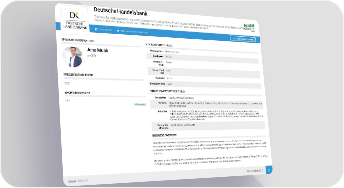 Deutsche Handelsbank The bank for digital startups and growth companies. Providing Growth Financing and BaaS to fast growing companies with proven business model from Series A onwards. Helping already over 150 Scale-ups to lever their business with loans starting from 500k. Founded: 2009 https://www.handelsbank.com See More at NOAH Connect SPEAKER INFORMATION KEY CORPORATE FACTS Headquarters Munich, Germany Jens Munk Employees 51-100 co-CEO Investment Growth Stage Current Fund €m 1 Size PRESENTATION TOPIC Total AUM €m 10 Investment Style Active TBD TARGET INVESTMENT CRITERIA SHORT BIOGRAPHY Geographies Austria, Germany, Netherlands TBD Verticals Digital Health, Mobility & Travel of the Future, Edutech, Fintech & Insurtech, Ecommerce, Marketplaces & Classifieds, B2B READ MORE Software & Services Industries Artificial Intelligence / AI, B2B, Banking, Casual Gaming, Dating, Digital Services, E-Commerce, Financial Services, FinTech, InsurTech, PropTech, Software, Travel, Mobility, SaaS, Angel Investor, Buyout / Private Equity, Buyout Debt, Casual Dating, Content, Debt Capital Markets, E-Sports, Growth Capital, Lending, Money Transfers, Online Lottery, Online Payment, Payments, Pets, Recruiting, Debt Transaction Growth Capital, Venture Debt Structures BUSINESS OVERVIEW Deutsche Handelsbank is a specialised bank for digital startups and growth companies. We are deeply rooted in the technology startup ecosystem and dedicated to connecting and partnering with innovative technology companies, venture capital investors and domain experts. We accompany startups and digital growth companies along their way with growth financing, working capital, banking-as-a-service and factoring solutions. Our target group is in particular, we consider SaaS (Software as a Service, (AdTech, MarTech,…)), e-commerce, Internet of Things (IoT), InsurTech, FinTech, PropTech, Mobility, and all other innovative businesses with growth potential as our core markets. NOAH LONDON SPEAKER BOOK 92