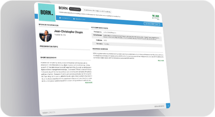 ce, Marketplaces & Classifieds E-Commerce Ecommer BORN Global market network where exciting creators can showcase their brands, their products and their personal profiles Founded: 2010 https://born.com/ See More at NOAH Connect SPEAKER INFORMATION KEY CORPORATE FACTS Headquarters London, United Kingdom Jean-Christophe Chopin Active Markets Austria, Belgium, Switzerland, Czech Republic, Germany, Denmark, Estonia, Spain, Finland, France, United Kingdom, Founder & CEO Greece, Ireland, Israel, Italy, Lithuania, Latvia, Netherlands, Norway, Poland, Portugal, Russia, Sweden, Turkey Employees 26-50 Ownership Founders PRESENTATION TOPIC BUSINESS OVERVIEW . BORN is a global market network where exciting creators can showcase their brands, their products and their personal profiles. Born's community of professionals and design enthusiasts come to BORN to find, fund and share beautiful new design products. Each year, BORN celebrates the world's best creative leaders with the internationally acclaimed BORN AWARDS. SHORT BIOGRAPHY READ MORE A creator and innovator by nature, JC is an entrepreneur who has had a strong presence in online financial services, digital insurance and stock brokerage. He has a wealth of international experience with expertise in the US as well as vast European digital and brand management knowledge. JC pioneered E*Trade Europe and Verisign in the early days of the Internet, and later went on to invest in real estate, time pieces and luxury fashion. His passion for skiing and extreme sports also led him to launch the 'Carre Neige' ski insurance within the Savoie region. Most recently, he has married his online finance expertise with his experience in design and luxury brands to create BORN, a B2B global market-network that connects design-led brands with retailers. READ MORE NOAH LONDON SPEAKER BOOK 10