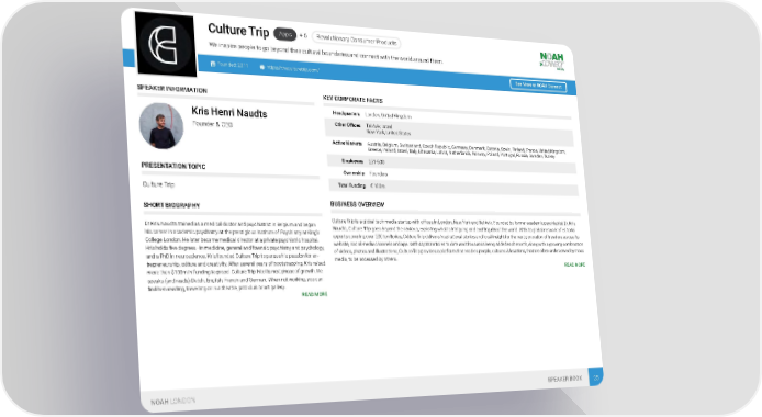 oducts Apps + 6 Revolutionary Consumer Pr Culture Trip We inspire people to go beyond their cultural boundaries and connect with the world around them. Founded: 2011 https://theculturetrip.com/ See More at NOAH Connect SPEAKER INFORMATION KEY CORPORATE FACTS Headquarters London, United Kingdom Kris Henri Naudts Other Offices Tel Aviv, Israel Founder & CEO New York, United States Active Markets Austria, Belgium, Switzerland, Czech Republic, Germany, Denmark, Estonia, Spain, Finland, France, United Kingdom, Greece, Ireland, Israel, Italy, Lithuania, Latvia, Netherlands, Norway, Poland, Portugal, Russia, Sweden, Turkey Employees 251-500 PRESENTATION TOPIC Ownership Founders Total Funding € 100m Culture Trip BUSINESS OVERVIEW SHORT BIOGRAPHY Culture Trip is a global tech-media startup with offices in London, New York and Tel Aviv. Founded by former academic psychiatrist Dr. Kris Dr Kris Naudts trained as a medical doctor and psychiatrist in Belgium and began Naudts, Culture Trip goes beyond the obvious, exploring what is intriguing and exciting about the world. With its global network of editorial his career in academic psychiatry at the prestigious Institute of Psychiatry at King’s experts covering over 200 territories, Culture Trip delivers inspirational stories and local insight for the next generation of travelers across its College London. He later became medical director at a private psychiatric hospital. website, social media channels and app. With 40,000 articles to date and thousands being added each month, along with a growing combination Kris holds five degrees - in medicine, general and forensic psychiatry and psychology, of videos, photos and illustrations, Culture Trip provides a platform that enables people, cultures & locations, that are often underserved by mass and a PhD in neuroscience. Kris founded Culture Trip to pursue his passion for en- media, to be accessed by others. trepreneurship, culture and creativity. After several years of bootstrapping, Kris raised READ MORE more than $100m in funding to propel Culture Trip into its next phase of growth. He speaks (and reads) Dutch, English, French and German. When not working, you can find him reading, travelling or in a theatre, jazz club or art gallery. READ MORE NOAH LONDON SPEAKER BOOK 25