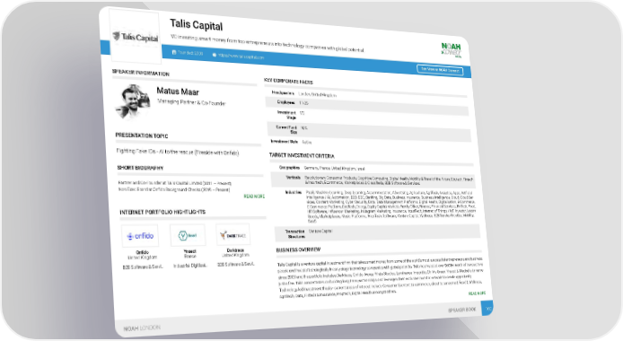 Talis Capital VC investing smart money from top entrepreneurs into technology companies with global potential. Founded: 2009 https://www.taliscapital.com See More at NOAH Connect SPEAKER INFORMATION KEY CORPORATE FACTS Headquarters London, United Kingdom Matus Maar Employees 11-25 Managing Partner & Co-Founder Investment VC Stage Current Fund N/A Size PRESENTATION TOPIC Investment Style Active Fighting Fake IDs - AI to the rescue (Fireside with Onfido) TARGET INVESTMENT CRITERIA Geographies Germany, France, United Kingdom, Israel SHORT BIOGRAPHY Verticals Revolutionary Consumer Products, Cognitive Computing, Digital Health, Mobility & Travel of the Future, Edutech, Fintech & Insurtech, Ecommerce, Marketplaces & Classifieds, B2B Software & Services Partner and Co-Founder at Talis Capital Limited (2011 – Present) Non Exec Board at Onfido Background Checks (2016 – Present) Industries PaaS, Machine Learning, Deep Learning, Accommodation, Advertising, Agriculture, AgriTech, Analytics, Apps, Artificial READ MORE Intelligence / AI, Automation, B2B, B2C, Banking, Big Data, Business Insurance, Business Intelligence, Cloud, Cloud Ser- vices, Content Marketing, Cyber Security, Data, Data Management Platforms, Digital Health, Digitalisation, E-Commerce, E-Commerce Platform, EduTech, Energy, Equity Capital Markets, Family Office, Finance, Financial Services, FinTech, Food, INTERNET PORTFOLIO HIGHTLIGHTS HR Software, Influencer Marketing, Instagram Marketing, Insurance, InsurTech, Internet of Things / IoT, Investor, Luxury Goods, Marketplaces, Music Platforms, PropTech, Software, Venture Capital, Wellness, B2B Service Provider, Mobility, SaaS Transaction Venture Capital Structures Onfido Ynsect Darktrace BUSINESS OVERVIEW United Kingdom France United Kingdom B2B Software & Servi… Industrial Digitisat… B2B Software & Servi… Talis Capital is a venture capital investment firm that takes smart money from some of the world’s most successful entrepreneurs and business people and invests it strategically in early stage technology companies with global potential. Talis has invested over $600m worth of transactions since 2009 and the portfolio includes Darktrace, Onfido, iwoca, Pirate Studios, Luminance, import.io, Oh My Green, Ynsect & Medbelle to name just a few. Talis concentrates on building long term partnerships and leverages their exclusive investor network to create opportunity. Technology led investment thesis - current areas of interest include Consumer (content to commerce, direct to consumer) Food & Wellness, AgriTech, Data, Fintech & Insurance, Proptech, Digital Health amongst others. READ MORE NOAH LONDON SPEAKER BOOK 102