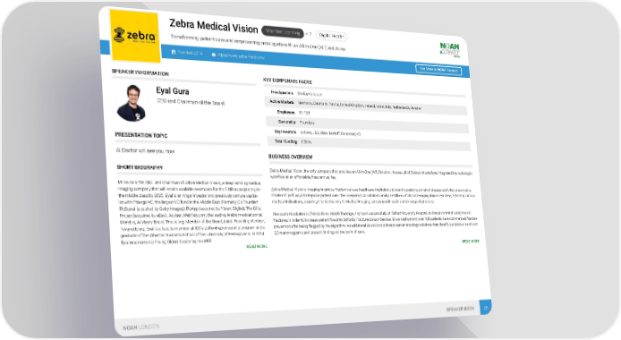 Machine Learning + 7 Digital Health Zebra Medical Vision ransforming patient care and empowering radiologists with an All-In-One (AI1) solutions T Founded: 2014 https://www.zebra-med.com/ See More at NOAH Connect SPEAKER INFORMATION KEY CORPORATE FACTS Headquarters Shefayim, Israel Eyal Gura Active Markets Germany, Denmark, France, United Kingdom, Ireland, Israel, Italy, Netherlands, Sweden CEO and Chairman of the Board Employees 51-100 Ownership Founders Key Investors aMoon, J&J, Marc Benioff, Ourcrowd, KV PRESENTATION TOPIC Total Funding € 50m AI Doctor will see you now BUSINESS OVERVIEW SHORT BIOGRAPHY Zebra Medical Vision, the only company that provides an All-In-One (AI1) Solution. Access all of Zebra’s AI solutions integrated into radiologist workflow at an affordable, fixed annual fee. Mr. Gura is the CEO and Chairman of Zebra Medical Vision, a deep learning medical Zebra Medical Vision’s Imaging Analytics Platform allows healthcare institutions to identify patients at risk of disease and offer preventative imaging company that will enable scalable healthcare for the 2 billion people to join treatment pathways to improve patient care. The company’s AI solutions analyze millions of clinical imaging data in real-time, detecting various the middle class by 2025. Eyal is an Angel investor and previously venture capital- medical indications, enabling it to be the only AI Medical Imaging company with such a wide range of products. ist with Pitango VC, the largest VC fund in the Middle East. Formerly, Co-Founder: PicScout (acquired by Getty Images); PicApp (acquired by Ybrant Digital); The Gifts One such AI solution is Zebra’s Bone Health Package, deployed successfully at Oxford University Hospital to detect vertebral compression Project (acquired by eBay). Adviser, WebTeb.com, the leading Arabic medical portal. fractures in order to increase patient flow into Oxford’s Fracture Liaison Service. Since deployment, over 100 patients have commenced fracture Member, Advisory Board, Tmura.org. Member of the Board, Latet. Founding Member, prevention after being flagged by the algorithm. An additional AI solution is breast cancer oncology solutions that identify suspicious lesions on Tovanotb.org. Eyal is a faculty member at IDC's Zell entrepreneurship program and a 2D mammograms and present findings at the point of care. graduate of the Wharton Business School of the University of Pennsylvania. In 2014 Eyal was named a Young Global Leader by the WEF READ MORE READ MORE NOAH LONDON SPEAKER BOOK 86