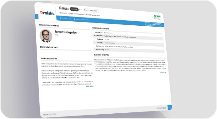 Banking + 4 Fintech & Insurtech Raisin Raise your interest with Europe's #1 deposit marketplace Founded: 2013 http://www.raisin.com See More at NOAH Connect SPEAKER INFORMATION KEY CORPORATE FACTS Headquarters Berlin, Germany Tamaz Georgadze Active Markets Austria, Germany, Spain, France, United Kingdom, Netherlands CEO Employees 101-250 Ownership Financial Investors Key Investors Index Ventures, Thrive Capital, PayPal, Goldman Sachs PRESENTATION TOPIC Total Funding € 187m . BUSINESS OVERVIEW SHORT BIOGRAPHY Raisin (also known as WeltSparen) is the leading pan-European savings and investment marketplace connecting retail customers with banks looking to expand or diversify their deposit reach. We are available in English across Europe and operate country-dedicated platforms in Germany, France, Spain, the United Kingdom, the Netherlands and Austria. Raisin is one of the leading fintech companies in Europe and has been featured Tamaz Georgadze As CEO he leads Raisin and takes in particular care of partner bank on The FinTech50 list of the top 50 fintechs across Europe in 2016, 2017 and 2018. Our platforms are the #1 online marketplace for term acquisition, business development, legal and regional expansion efforts. deposits worldwide with more than 180,000 satisfied customers and exceed €13 billion in deposits invested via the Raisin platforms. Through our partnership with Vanguard and BNP Paribas we also offer a broad range of cost-effective ETFs. Prior to building and scaling Raisin, Tamaz has spent 10 years with McKinsey & READ MORE Company, the last 3 years as Principal leading also McKinsey Savings and Investment products Service Line for EMEA countries. He served some of the very largest retail, universal and wholesale banks throughout Europe and in Asia. Tamaz holds a PhD in agricultural economics, graduated with honors in law (both from University of Giessen) and international economics (from Tbilisi State University). READ MORE NOAH LONDON SPEAKER BOOK 60