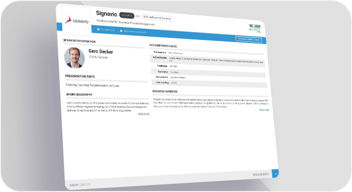 Analytics + 5 B2B Software & Services Signavio vider for Business Process Management Cloud pro Founded: 2009 http://www.signavio.com/ See More at NOAH Connect SPEAKER INFORMATION KEY CORPORATE FACTS Headquarters Berlin, Germany Gero Decker Active Markets Austria, Belgium, Switzerland, Germany, Denmark, Finland, France, United Kingdom, Ireland, Netherlands, Norway, Swe- CEO & Founder den Employees 251-500 Ownership Founders Key Investors Summit Partners PRESENTATION TOPIC Total Funding € 47m Enabling Business Transformation at Scale BUSINESS OVERVIEW SHORT BIOGRAPHY Signavio is a cloud provider that helps mid-sized and large organizations understand, improve and transform all of their business processes. With more than 1m users in over 1,000 organizations, Signavio is a global leader for Business Process Management. Signavio is the only Enterprise Gero is co-founder & CEO of Signavio. Prior to that, he worked for SAP and McKinsey. Business Process Analysis vendor that has received a Gartner Customer Choice Award. He is a software engineer by training, has a PhD in Business Process Management READ MORE and was named Innovator of the Year by MIT Technology Review. READ MORE NOAH LONDON SPEAKER BOOK 66