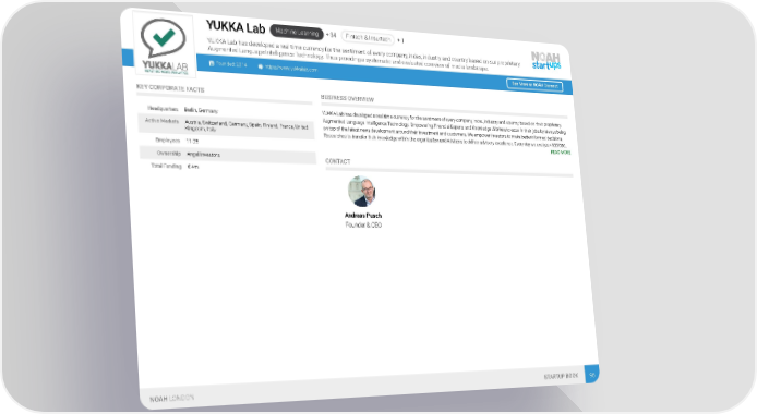 Machine Learning + 34 Fintech & Insurtech + 1 YUKKA Lab YUKKA Lab has developed a real time currency for the sentiment of every company, index, industry and country based on our proprietary Augmented Language Intelligence Technology. Thus providing a systematic and evaluated overview of media landscape. Founded: 2014 https://www.yukkalab.com See More at NOAH Connect KEY CORPORATE FACTS BUSINESS OVERVIEW YUKKA Lab has developed a real time currency for the sentiment of every company, index, industry and country based on their proprietary Headquarters Berlin, Germany Augmented Language Intelligence Technology. Empowering Financial Experts and Knowledge Workers to excel in their jobs by always being Active Markets Austria, Switzerland, Germany, Spain, Finland, France, United on top of the latest news development around their investment and customers. We empower investors to make betterinformed decisions, Kingdom, Italy Researches to transfer their knowledge within the organization and Advisors to deliver advisory excellence. Every day we analyze +500´000… READ MORE Employees 11-25 Ownership Angel Investors CONTACT Total Funding € 4m Andreas Pusch Founder & CEO NOAH LONDON STARTUP BOOK 96