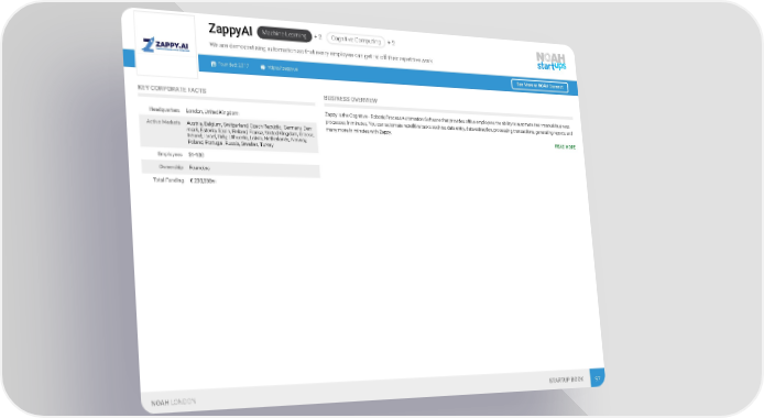 Machine Learning + 2 Cognitive Computing + 2 ZappyAI We are democratising automation so that every employee can get rid off their repetitive work Founded: 2017 https://zappy.ai See More at NOAH Connect KEY CORPORATE FACTS BUSINESS OVERVIEW Zappy is the Cognitive - Robotic Process Automation Software that provides office employees the ability to automate their manual business Headquarters London, United Kingdom processes in minutes. You can automate repetitive tasks such as data entry, data extraction, processing transactions, generating reports and Active Markets Austria, Belgium, Switzerland, Czech Republic, Germany, Den- many more in minutes with Zappy. mark, Estonia, Spain, Finland, France, United Kingdom, Greece, READ MORE Ireland, Israel, Italy, Lithuania, Latvia, Netherlands, Norway, Poland, Portugal, Russia, Sweden, Turkey Employees 51-100 Ownership Founders Total Funding € 200,000m NOAH LONDON STARTUP BOOK 97
