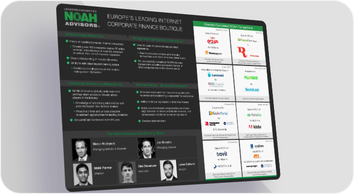 EUROPE’S LEADING INTERNET Selected Completed NOAH Transactions CORPORATE FINANCE BOUTIQUE September 2018 July 2018 ® Sale of 100% in Sale of 100% in 10Bis Unique Industry Know-How Strong Investment Banking Competence to Focus on Leading European Internet companies Over 40 years of combined relevant M&A for €135m to Covering over 400 companies across 25 online experience verticals, a broad range of over 500 investors Routine execution of M&A and financing as well as 100+ online-focused corporates transactions with sizes of several billion euros Financial Advisor to 10bis Exclusive Financial Advisor to and its shareholders PromoFarma and its shareholders Deep understanding of industry dynamics 25+ successfully completed NOAH Advisors transactions underline successful transfer of August 2017 December 2016 Ability to add value beyond banking advice M&A competencies to the Internet sector Acquisition of a Majority Stake in Investment in Facilitates overall process and minimizes management distraction by by Unmatched Network and Relationships Full Commitment - We Are Entrepreneurs! at a valuation of $200m NOAH Advisors is globally well connected Entrepreneurial mind-set, focused on growing the and has direct access to virtually all key business and establishing a reputation for excellence Financial Advisor to EMK Capital Financial Advisor to Silver Lake players in the industry Knowledge of and strong relationships with Ability to deliver top results in short time frames October 2016 December 2014 potential buyers’ key decision makers Highly success-based compensation structures Investment in Sale of 100% of Proactively finds and unlocks attractive align interests of clients and NOAH Advisors, and investment opportunities for leading investors demonstrate conviction to deliver top results Annual NOAH Conference in its 8th year by Creative deal solutions for $800m to 84% Ownership The NOAH Advisors Core Banking Team Exclusive Financial Advisor to KäuferPortal Exclusive Financial Advisor to and its Shareholders Fotolia and the Selling Shareholders Marco Rodzynek Jan Brandes October 2014 May 2014 Managing Director & Founder Managing Director Sale of 100% of sold 100% of for €80m to Nikhil Parmar Olek Skwarczek Lukas Schlund for $228m to a joint venture between Director Associate Analyst Exclusive Financial Advisor to Exclusive Financial Advisor to Yad2 Trovit and its Shareholders and its Shareholders