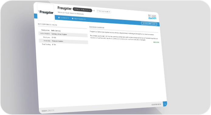 Artificial Intelligence / AI + 5 Fintech & Insurtech Fraugster Minimize Fraud. Maximize Revenues. Founded: 2014 https://fraugster.com/ See More at NOAH Connect KEY CORPORATE FACTS BUSINESS OVERVIEW Fraugster is a German-Israeli payment security company using proprietary AI technology to eliminate fraud and maximize revenues. Headquarters Berlin, Germany Active Markets Germany, United Kingdom The company was founded in 2014 by Max Laemmle and Chen Zamir with the vision to design and build an anti-fraud technology that could help create a fraud free world - one where e-commerce merchants would never have to worry about fraud again. Employees 51-100 READ MORE Ownership Financial Investors Total Funding € 19m NOAH LONDON STARTUP BOOK 29