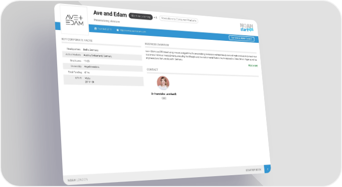 Machine Learning + 3 Revolutionary Consumer Products Ave and Edam Personalizing skincare Founded: 2018 http://www.aveandedam.com See More at NOAH Connect KEY CORPORATE FACTS BUSINESS OVERVIEW Ave + Edam is a DTC brand using innovative algorithms for personalizing products to reshape beauty care and make products truly match their Headquarters Berlin, Germany customers individual needs & wants, analyzing their lifestyle and the environmental factors they're exposed to. Clean. Smart. Vegan as well as Active Markets Austria, Switzerland, Germany engineered and fairly produced in Germany. READ MORE Employees 11-25 Ownership Angel Investors CONTACT Total Funding € 1m KPI #1 Visits 2019 - 0k Dr Franziska Leonhardt CEO NOAH LONDON STARTUP BOOK 4