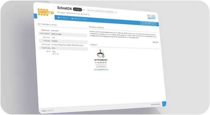 Industrial + 1 Ecommerce, Marketplaces & Classifieds + 2 Schrott24 Managed marketplace for scrap metal trading Founded: 2016 https://www.schrott24.at See More at NOAH Connect KEY CORPORATE FACTS BUSINESS OVERVIEW Schrott24 is a B2B-focused managed marketplace for metal scrap. We help recyclers to source more material and scrap metal producers Headquarters Graz, Austria to market their metal waste more efficiently. Besides matching supply and demand, the fulfillment of transactions is processed through our Active Markets Austria, Germany proprietary technology. We digitalize processes and increase the efficiency of the recycling industry. Employees 11-25 READ MORE Ownership Founders CONTACT Key Investors FJ Labs, Fil Rouge Capital, Gisbert Rühl (CEO Klöckner) Total Funding € 2m KPI #1 Visits 2019 - 1m Jan Pannenbaecker Co- founder & MD Contact me Attending NOAH19 London NOAH LONDON STARTUP BOOK 73