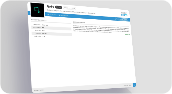FinTech Fintech & Insurtech Qadra Qadra is a next-generation robo-based Wealth Management company for affluent people. Founded: 2018 https://qadra.com See More at NOAH Connect KEY CORPORATE FACTS BUSINESS OVERVIEW Qadra is a next-generation Wealth Management company for affluent people, with investable assets between €50k and €5M. Differently from Headquarters Milano, Italy traditional robo advisors our value proposition is based on Total Return Alpha Generation strategies, a fully digital platform that allows clients Active Markets Italy to be looked after by a Wealth Manager if they wish so, an open and fully scalable platform that connects with any other service in the Fintech Space. Our vision is to make high-end asset management services, accessible to the masses. Employees 4-10 READ MORE Ownership Founders Total Funding € 1m NOAH LONDON STARTUP BOOK 67