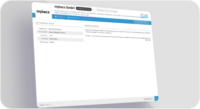 Healthcare / Pharma + 1 Revolutionary Consumer Products mybacs GmbH We are a Swiss pharma company with offices in Zug and Munich. At mybacs, the focus lies on the human microbiome and the development of highly dosed, state of the art synbiotic supplements. Founded: 2018 https://mybacs.co See More at NOAH Connect KEY CORPORATE FACTS BUSINESS OVERVIEW mybacs is a Swiss pharma company with offices in Zug and Munich. At mybacs the focus lies on the human microbiome and the development Headquarters Baar, Zug, Switzerland of highly dosed, state of the art synbiotic supplements. Active Markets Austria, Switzerland, Germany Travelbacs - the first mybacs product was launched in February 2019. Travelbacs is a synbiotic compound which was specifically adapted to the… Employees 11-25 READ MORE Ownership Angel Investors Total Funding € 0.24m NOAH LONDON STARTUP BOOK 51