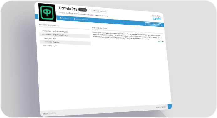 FinTech + 1 Fintech & Insurtech Pomelo Pay Helping merchants accept payments without any specialist hardware Founded: 2017 www.pomelopay.com See More at NOAH Connect KEY CORPORATE FACTS BUSINESS OVERVIEW Pomelo Pay helps merchants accept payments without the need of specialist hardware. By downloading our app, merchants can accept Headquarters London, United Kingdom payments in minutes. Anyone with a smartphone can pay , as customers simply use their camera to scan the Paycode generated by the Active Markets Belgium, United Kingdom merchant. Merchants no longer have to carry around and pay for expensive hardware simply to take payments. READ MORE Employees 4-10 Ownership Founders Total Funding € 1m NOAH LONDON STARTUP BOOK 64