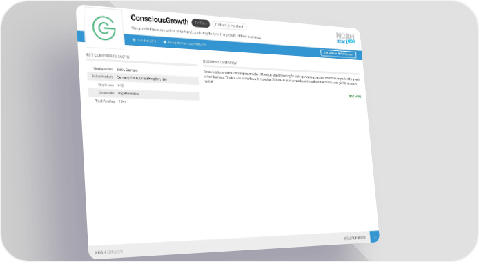 FinTech Fintech & Insurtech ConsciousGrowth We provide founders with a smart and quick way to fund the growth of their business. Founded: 2019 www.getconsciousgrowth.com See More at NOAH Connect KEY CORPORATE FACTS BUSINESS OVERVIEW ConsciousGrowth is the first European provider of Revenue-Based Financing for scale-ups wanting to access smart financing to fund the growth Headquarters Berlin, Germany of their business. This is a ~$4.5B market, with more than 25,000 European companies with healthy unit economics and yet little access to Active Markets Germany, Spain, United Kingdom, Italy capital. Employees 4-10 READ MORE Ownership Angel Investors Total Funding € 2m NOAH LONDON STARTUP BOOK 14