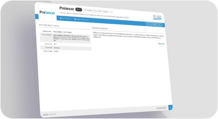 PaaS Revolutionary Consumer Products + 3 Prolancer Hire top rated professional freelancers in software, data Science and advanced programming (AI/ML). Founded: 2019 https://Prolancer.com See More at NOAH Connect KEY CORPORATE FACTS BUSINESS OVERVIEW Prolancer is the next-gen marketplace for remote working and smart talent-sourcing in the niche fields of Software, Data Science and Advanced Headquarters Kings Langley, United Kingdom Programming (AI/ML). We use advanced technologies to help businesses to connect better, hire faster and work smarter with top rated Active Markets Austria, Belgium, Switzerland, Germany, Denmark, Estonia, professionals. Spain, Finland, France, United Kingdom, Greece, Ireland, Italy, Lithuania, Latvia, Netherlands, Norway, Poland, Portugal, Swe- READ MORE den Employees 4-10 Ownership Founders Total Funding € 0.3m NOAH LONDON STARTUP BOOK 65