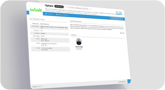 Collaboration + 7 Ecommerce, Marketplaces & Classifieds + 1 Optune Optune is the first B2B booking platform connecting all stakeholders in the booming live music industry. The platform facilitates daily tasks with a focus on event management and booking processing. The booking.com of the live music industry! Founded: 2016 https://www.optune.me/ See More at NOAH Connect KEY CORPORATE FACTS BUSINESS OVERVIEW Optune is the first B2B booking platform connecting all stakeholders in the booming live music industry (+300% revenue growth within 15 yrs). Headquarters Zurich, Switzerland The platform facilitates daily tasks with a focus on event management and booking processing. The booking.com of the live music industry! Active Markets Switzerland, Germany, Spain, France, United Kingdom, Nether- Optune revolutionizes the existing workflow regarding efficiency, transparency and data driven optimization. lands READ MORE Employees 4-10 Ownership Founders CONTACT Total Funding € 0.6m KPI #1 Active artists 2019 - - 660Units KPI #2 Bookings entered on the platform 2018 - 16k Patrick Horka KPI #3 YoY growth rate artists Co-Founder 2019 - 550% NOAH LONDON STARTUP BOOK 59
