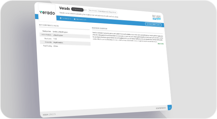 E-Commerce + 4 Ecommerce, Marketplaces & Classifieds Verado Verado is dedicated to providing the most convenient solutions to sell used valuables. Founded: 2016 http://verado.com See More at NOAH Connect KEY CORPORATE FACTS BUSINESS OVERVIEW Verado is dedicated to providing sellers with a platform to re-sell valuables conveniently, rapidly and at fair prices. Verado’s platform aggregates Headquarters London, United Kingdom offers from thousands of national and international dealers to make sure you’ll always get the best the market is paying for your items. Led by Active Markets United Kingdom the very best in the luxury goods market, we work together to bring you the fairest market value for your valuable items while providing stellar service. Whether you need financing to run your small business, to plan for the future, or to go on a vacation, we are here for you. Employees 11-25 READ MORE Ownership Angel Investors Total Funding € 0.4m NOAH LONDON STARTUP BOOK 89