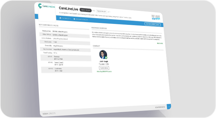 Digital Health + 2 Digital Health + 1 CareLineLive A complete cloud-based care management system for home care agencies giving them more Time to Care. Founded: 2018 www.carelinelive.com See More at NOAH Connect KEY CORPORATE FACTS BUSINESS OVERVIEW CLL enables a home care agency to run its entire business from anywhere. Its cloud-based platform enables visit scheduling and carer rotas Headquarters Slinfold, United Kingdom to be done easily and shared with all parties in real-time, comprehensive call monitoring (client visit data) via a mobile app, eMAR (electronic Other Offices London, United Kingdom Medical Administration Records), automates client invoicing and staff pay and has care plan creation and management in development. Active Markets United Kingdom, Ireland READ MORE Employees 11-25 CONTACT Ownership Angel Investors Key Investors Asset Match, Avonmore Developments Ltd Total Funding € 1m KPI #1 Revenue 2019 - £ 756k Josh Hough KPI #2 Carers (Users) Founder / CEO 2019 - 3,447# Contact me KPI #3 Customers 2019 - 136# Attending NOAH19 London NOAH LONDON STARTUP BOOK 9