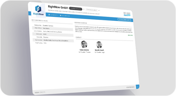 Direct-to-Consumer + 1 Fintech & Insurtech + 1 RightNow GmbH RightNow reimburses consumer claims within 24 hours, thus providing "justice-as-a-service". Founded: 2016 www.rightnow.de See More at NOAH Connect KEY CORPORATE FACTS BUSINESS OVERVIEW RightNow revolutionizes peoples' access to justice. Through its platform, RightNow buys consumer claims from everyday life situations and Headquarters Düsseldorf, Germany pays a large part of the reimbursement within 24 hours. By focussing on micro-claims, i.e., claims that are usually not attractive for standard Other Offices Kiev, Ukraine legal proceedings, RightNow opens an entirely new market to both consumers and lawyers as it manages to acquire, analyze, and process these claims at scale. Active Markets Austria, Switzerland, Germany, Sweden READ MORE Employees 26-50 CONTACT Ownership Founders Key Investors Monkfish Equity, Maschmeyer Group, Equitypitcher Total Funding € 3m Torben Antretter Benedikt Quarch Co-Founder | Finance Co-Founder | Legal NOAH LONDON STARTUP BOOK 70