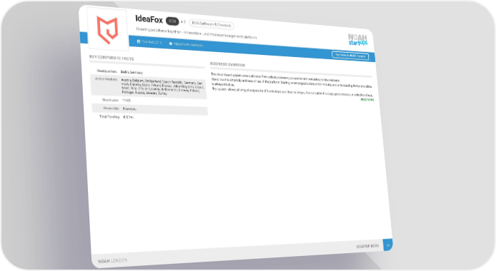 B2B + 7 B2B Software & Services IdeaFox Creating solutions together - Innovation- und Processmanagement platform Founded: 2016 https://www.ideafox.io See More at NOAH Connect KEY CORPORATE FACTS BUSINESS OVERVIEW The cloud based system covers all steps from collective ideation, co-creation and evaluation, to idea realization. Headquarters Berlin, Germany Users love the simplicity and ease of use of the platform: Starting a new project is done within minutes, and understanding the functionalities Active Markets Austria, Belgium, Switzerland, Czech Republic, Germany, Den- is always intuitive. mark, Estonia, Spain, Finland, France, United Kingdom, Ireland, The system allows tailoring of projects for different purposes: Idea challenges, idea realization in a stage gate processes, or collection of best… Israel, Italy, Lithuania, Latvia, Netherlands, Norway, Poland, READ MORE Portugal, Russia, Sweden, Turkey Employees 11-25 Ownership Founders Total Funding € 0.1m NOAH LONDON STARTUP BOOK 40