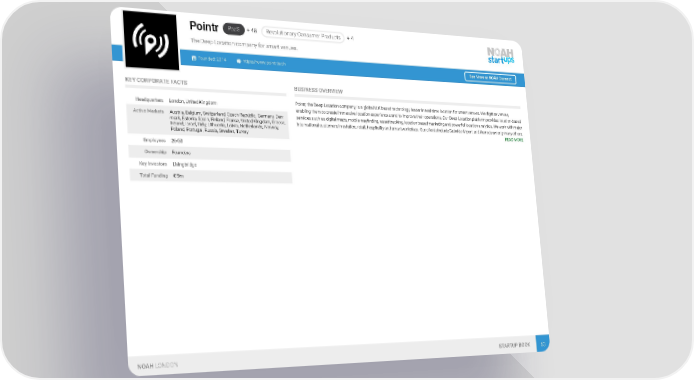 PaaS + 48 Revolutionary Consumer Products + 4 Pointr The Deep Location company for smart venues. Founded: 2014 https://www.pointr.tech See More at NOAH Connect KEY CORPORATE FACTS BUSINESS OVERVIEW Pointr, the Deep Location company, is a global U.K based technology leader in real-time location for smart venues. We digitise venues, Headquarters London, United Kingdom enabling them to create immersive location experiences and to improve their operations. Our Deep Location platform provides location-based Active Markets Austria, Belgium, Switzerland, Czech Republic, Germany, Den- services such as digital maps, mobile wayfinding, asset tracking, location-based marketing and powerful location analytics. We work with major mark, Estonia, Spain, Finland, France, United Kingdom, Greece, international customers in aviation, retail, hospitality and smart workplace. Our clients include Gatwick Airport and Harrods among many others. Ireland, Israel, Italy, Lithuania, Latvia, Netherlands, Norway, READ MORE Poland, Portugal, Russia, Sweden, Turkey Employees 26-50 Ownership Founders Key Investors Livingbridge Total Funding € 5m NOAH LONDON STARTUP BOOK 63