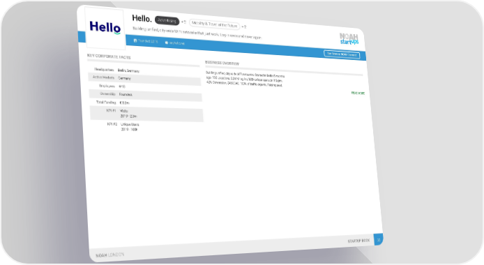 Advertising + 2 Mobility & Travel of the Future + 2 Hello. Building unified, city-wide WiFi networks that just work. Log-in once and never again. Founded: 2018 sayhello.net See More at NOAH Connect KEY CORPORATE FACTS BUSINESS OVERVIEW Building unified, city-wide WiFi networks. Started in Berlin 5 months Headquarters Berlin, Germany ago. 150 Locations, 2.3MM log-ins,180k unique users on 1 Sqkm. Active Markets Germany 42% Conversion, $450CAC. 100% of traffic organic. Raising seed. READ MORE Employees 4-10 Ownership Founders Total Funding € 0.3m KPI #1 Visits 2019 - 2.3m KPI #2 Unique Users 2019 - 180k NOAH LONDON STARTUP BOOK 38
