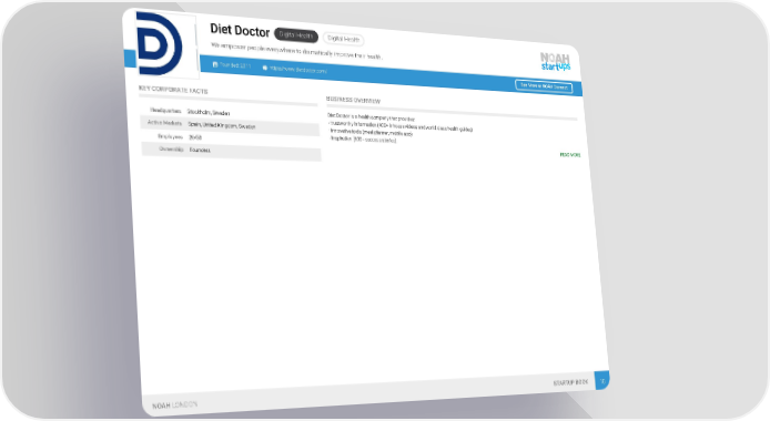 Digital Health Digital Health Diet Doctor We empower people everywhere to dramatically improve their health. Founded: 2011 https://www.dietdoctor.com/ See More at NOAH Connect KEY CORPORATE FACTS BUSINESS OVERVIEW Diet Doctor is a health company that provides: Headquarters Stockholm, Sweden - trustworthy information (400+ inhouse videos and world class health guides) Active Markets Spain, United Kingdom, Sweden - innovative tools (meal planner, mobile app) - inspiration (600+ success stories) Employees 26-50 READ MORE Ownership Founders NOAH LONDON STARTUP BOOK 18