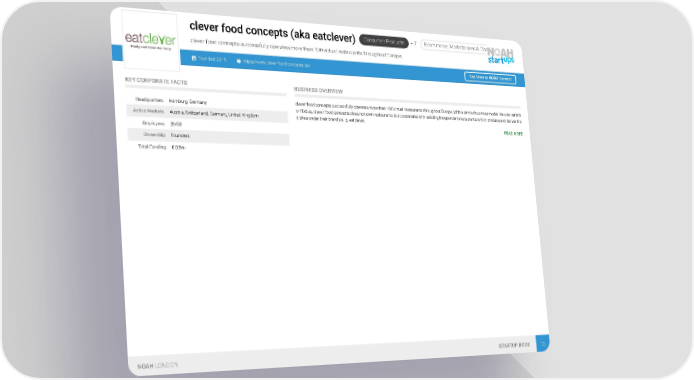 Consumer Products + 7 Ecommerce, Marketplaces & Classifieds clever food concepts (aka eatclever) clever food concepts successfully operates more than 100 virtual restaurants throughout Europe. Founded: 2015 https://www.clever-food-concepts.de/ See More at NOAH Connect KEY CORPORATE FACTS BUSINESS OVERVIEW clever food concepts successfully operates more than 100 virtual restaurants throughout Europe. With a similar business model like uber, airbnb Headquarters Hamburg, Germany or flixbus, clever food concepts does not own restaurants but cooperates with existing independent restaurants which produce and deliver the Active Markets Austria, Switzerland, Germany, United Kingdom dishes under their brands e. g. eatclever. READ MORE Employees 26-50 Ownership Founders Total Funding € 0.5m NOAH LONDON STARTUP BOOK 13