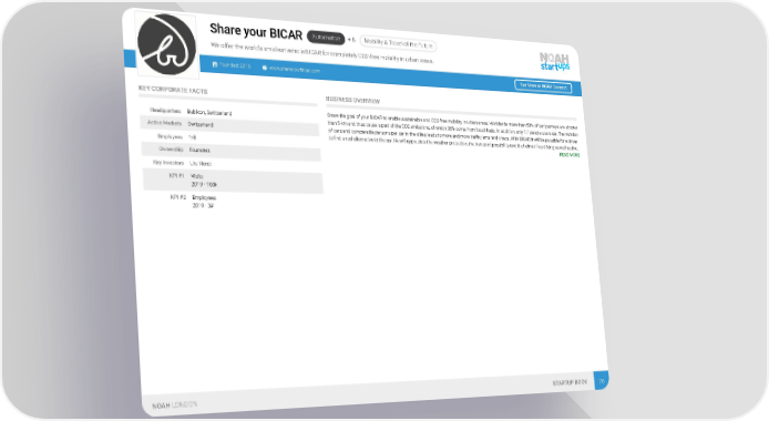 Automotive + 6 Mobility & Travel of the Future Share your BICAR We offer the world's smallest vehicle BICAR for completely CO2-free mobility in urban areas. Founded: 2016 www.shareyourbicar.com See More at NOAH Connect KEY CORPORATE FACTS BUSINESS OVERVIEW Share the goal of your BICAR to enable sustainable and CO2-free mobility in urban areas. Worldwide more than 50% of car journeys are shorter Headquarters Bubikon, Switzerland than 5 km and thus cause a part of the CO2 emissions, of which 36% come from fossil fuels. In addition, only 1.1 people use a car. The number Active Markets Switzerland of cars and comparable persons per car in the cities leads to more and more traffic jams and chaos. With BICAR it will be possible for a driver to find a real alternative to the car. He will appreciate the weather protection, the transport possibility and the helmet-free driving as well as the… Employees 1-3 READ MORE Ownership Founders Key Investors Urs Horat KPI #1 Visits 2019 - 100k KPI #2 Employees 2019 - 3# NOAH LONDON STARTUP BOOK 76