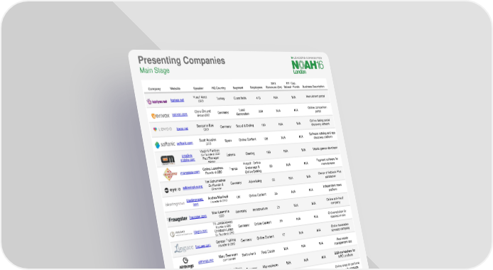 Presenting Companies MainStage 2015 EV / Cap. Company Website Speaker HQCountry Segment Employees Revenues ($m) Raised / Funds Business Description kariyer.net Yusuf Azoz Turkey Classifieds 413 N/A N/A Recruitment portal CEO verivox.com Chris Öhlund Germany Lead 330 N/A N/A Online comparison Group CEO Generation portal lovoo.net Benjamin Bak Germany Social & Dating 130 N/A N/A Online dating social CEO discovery network softonic.com Scott Arpajian Spain Online Content 130 N/A N/A Software catalog and app CEO discovery platform creative- Vladimir Funtikov Co-Founder & CEO Estonia Gaming 100 N/A N/A Mobile games developer mobile.com Paul Flanagan Advisor Celine Lazorthes Fintech, Online Payment software for mangopay.com Founder & CEO France Brokerage & 60 N/A N/A marketplaces Online Betting Tim Schumacher Owner of Adblock Plus adblockplus.org Co-Founder & Germany Advertising 55 N/A N/A ad blocker Chairman blastingnews. Andrea Manfredi UK Online Content 35 N/A N/A Independent news com Founder & CEO platform fraugster.com Max Laemmle Germany Infrastructure 21 N/A N/A Online anti-fraud CEO company Till Janczukowicz Online solution for idagio.com Founder & CEO Germany Online Content 20 N/A N/A Christoph Lange classical music Co-Founder & CPO linguee.com Gereon Frahling Germany Online Content 17 N/A N/A Online translation Founder & CEO services company allthings.me Marc Beermann Switzerland Real Estate N/A N/A N/A Real estate Co-Founder management app contorion.de Tobias Tschötsch Germany Marketplaces N/A N/A N/A B2B marketplace for Founder & CEO MRO products Daniel Raab Online shop for perfume flaconi.de Managing Director, Germany Ecommerce N/A N/A N/A and beauty products SevenVentures excitingcommerce Sven Rittau Germany Ecommerce N/A N/A N/A Business intelligence .de CEO platform for ecommerce improvedigital. Joelle Frijters Netherlands Advertising N/A N/A N/A Real-time advertising com Co-Founder & CEO platform moneysaving Andy Hancock UK Lead N/A N/A N/A Consumer finance expert.com Managing Director Generation website sybenetix.com Wendy Jephson UK Infrastructure N/A N/A N/A Enterprise behavioral Co-Founder analytics company voyage- Alexandre Online members-only prive.com Fontaine France Travel N/A N/A N/A luxury travel club Co-Founder Boaz Yaari Fintech, Online Securities lending sharegain.com CEO UK Brokerage & N/A N/A N/A platform Online Betting Martin Bryant Entrepreneurship techcityuk.com Community Editor, UK Media N/A N/A N/A growth program for UK Tech North Ruzgar Barisik Global development ifc.org Senior Investment US VC 3,400 N/A FR: $5.0bn institution Officer atomico.com Mattias Ljungman UK VC N/A N/A FR: $1.4bn International venture Partner capital firm Note: All private company valuations are based on public news. * Public company. 5